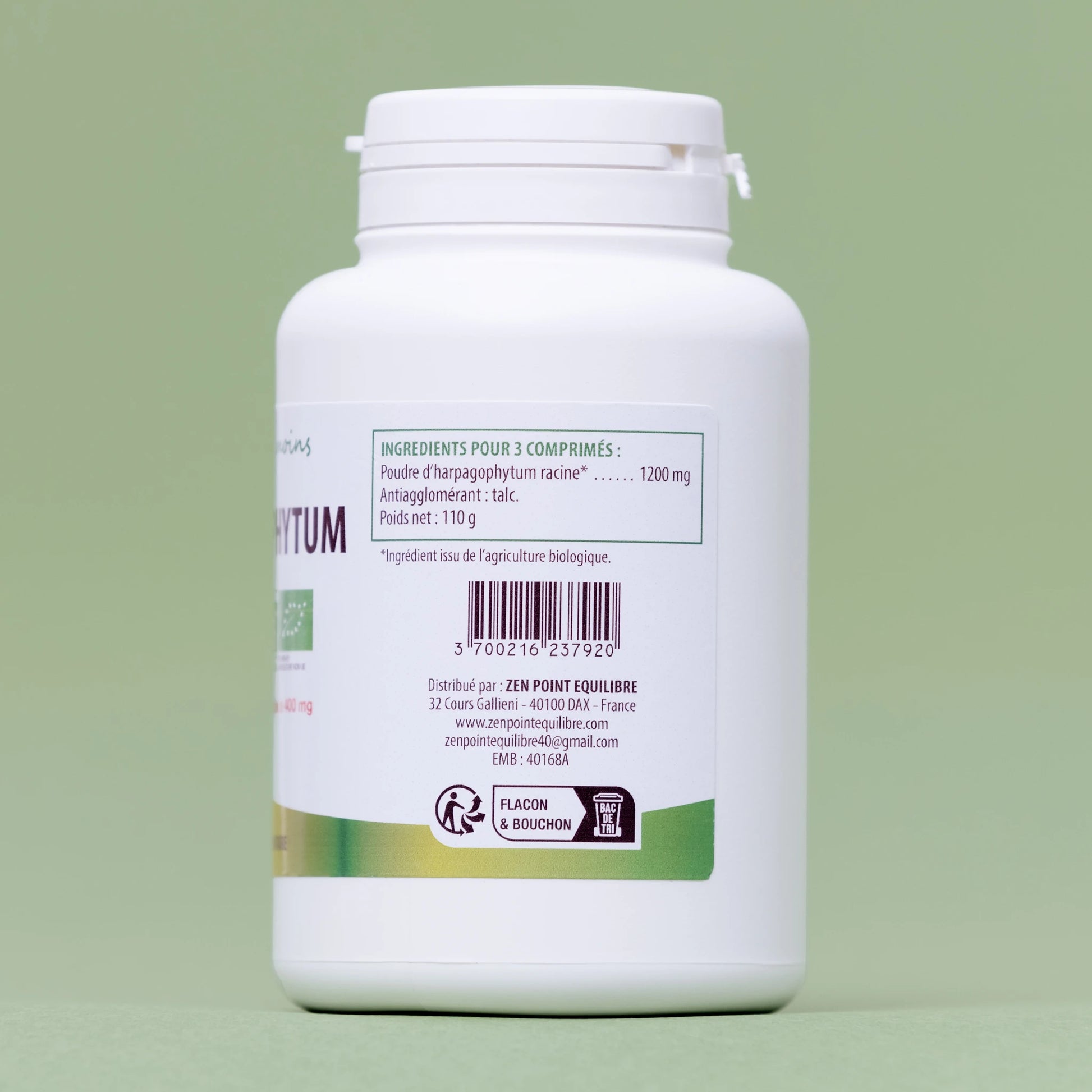 Notre Harpagophytum Bio certifié Agriculture Biologique concentre tous les bienfaits de cette plante dans une boîte de 200 comprimés facile à utiliser. Chaque comprimé délivre 400 mg de poudre de racine d’harpagophytum issue de l’agriculture biologique, sans aucun additif superflu (seul un agent anti-agglomérant minéral est présent). Avec une prise recommandée de 2 à 3 comprimés par jour, vous obtenez ainsi 800 à 1200 mg de racine par jour pour soutenir la souplesse de vos articulations et contribuer à leur confort.