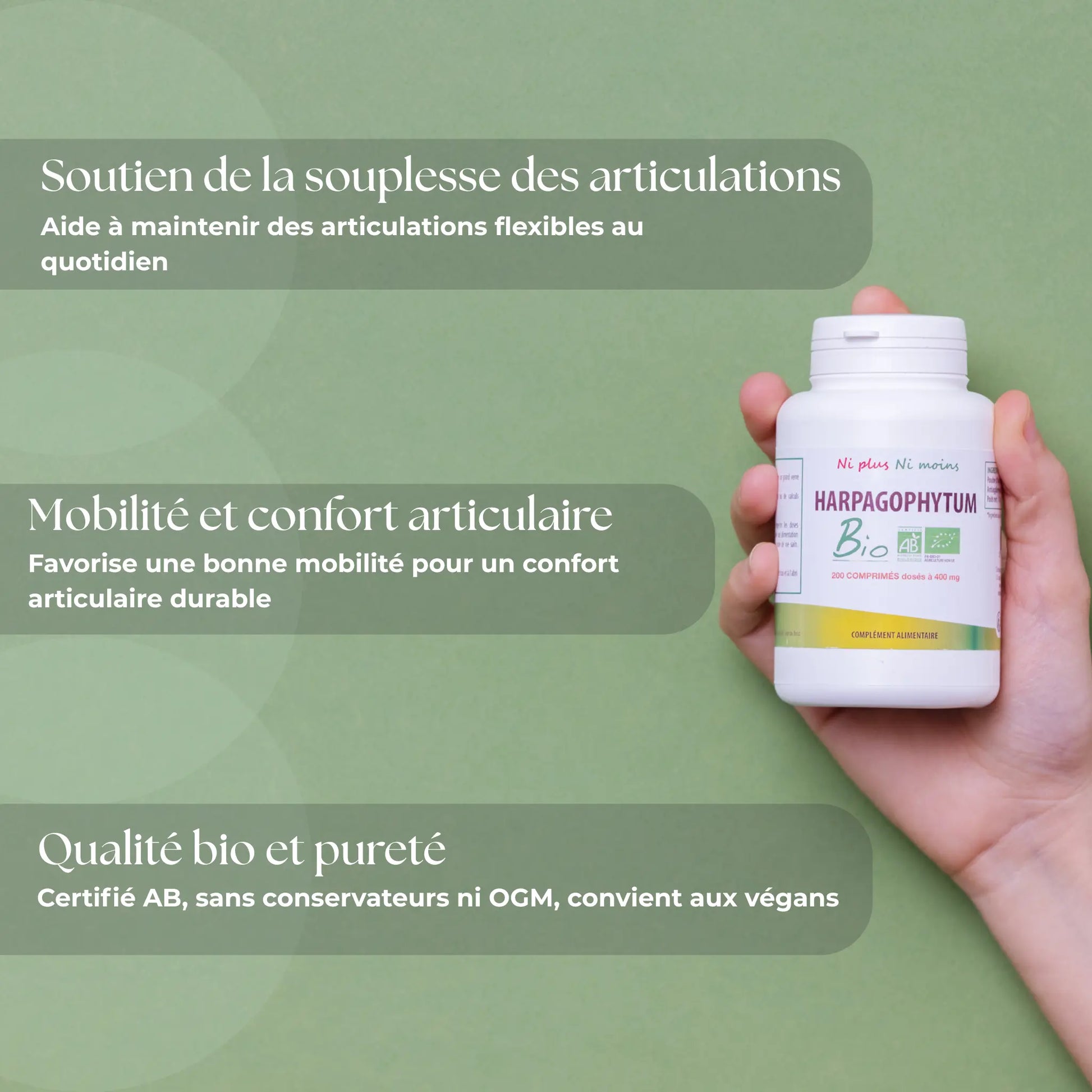 N’attendez plus pour prendre soin de vos articulations de façon naturelle – ajoutez dès maintenant notre Harpagophytum bio à votre panier et retrouvez une meilleure mobilité au quotidien !