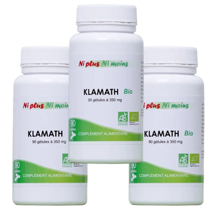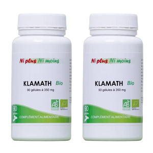 L’algue Klamath est une micro-algue cyanobactérie unique, encore plus riche en vitamines, minéraux et oligo-éléments que sa cousine la spiruline. Récoltée dans le lac Klamath aux États-Unis, son environnement exceptionnel (eau volcanique pure, fort ensoleillement, pH neutre) lui confère une concentration nutritive inégalée. Chaque gélule de Klamath Bio de 350 mg renferme ainsi un concentré de nutriments essentiels : tous les acides aminés, des dizaines de minéraux (fer, magnésium, zinc, calcium, etc.) et de vitamines (A, C, E, K et vitamines B variées). Ces éléments agissent en synergie pour soutenir votre forme et votre santé.