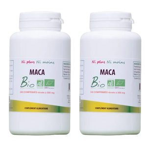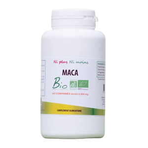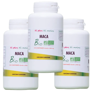 Notre Maca Bio certifiée AB est issue de l'agriculture biologique (sans pesticides ni OGM) et préserve l'ensemble des nutriments de la racine. Présentée en poudre de racine pressée sous forme de comprimés de 500 mg, elle offre un dosage modulable de 5 à 20 comprimés par jour selon vos besoins (soit 2,5 g à 10 g de maca pure), à répartir aux repas avec un grand verre d'eau.